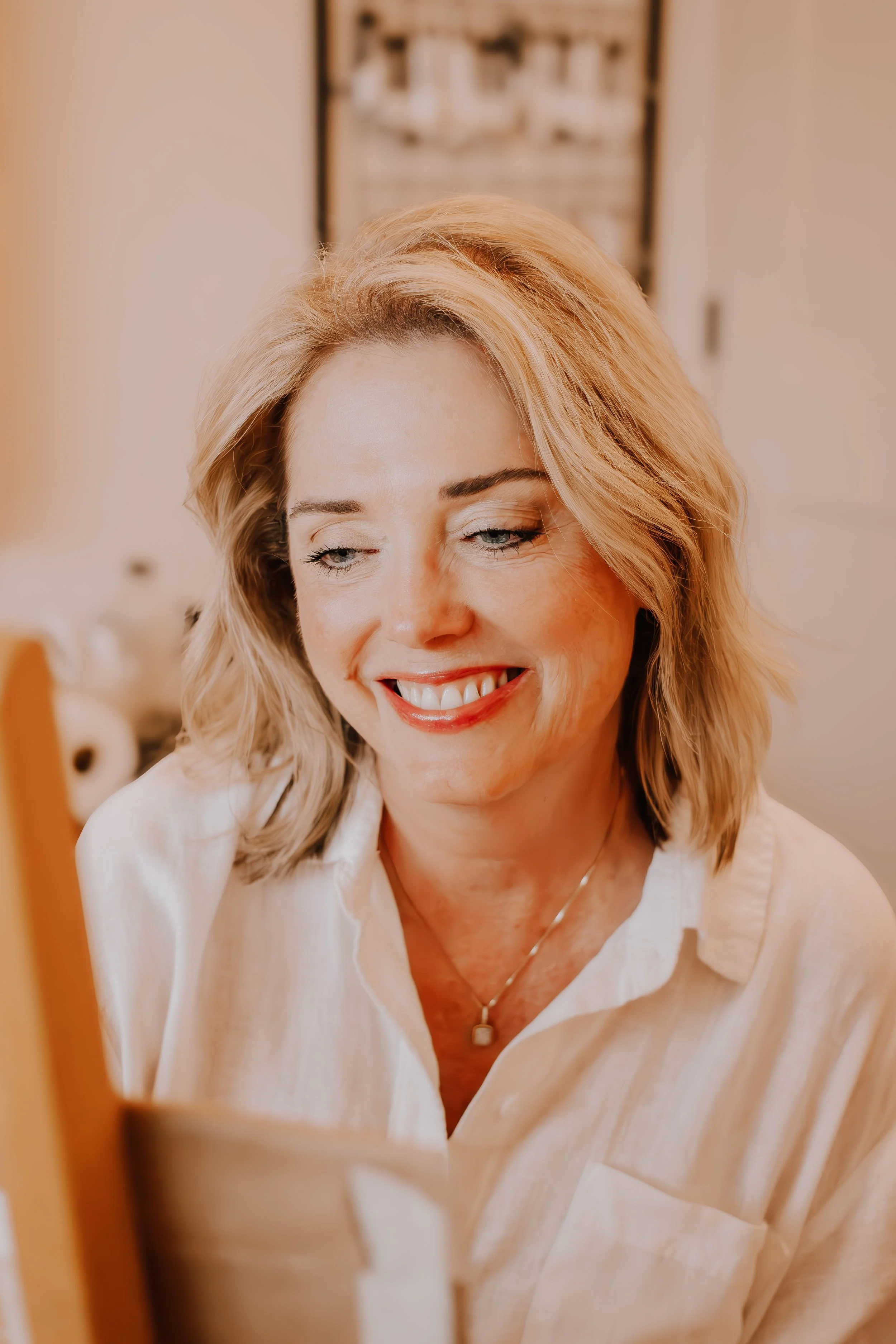 Living room with a brown sofa, decorative pillows, and wall art, illuminated by two table lamps with beige shades and textured bases.